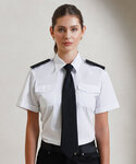 Women's short sleeve easy care pilot shirt. Stiffened collar. 2 chest pockets with button flaps. Combined pen pocket on left breast pocket. Short sleeves. Epaulettes on shoulders. Easy care – soil resist finish. Size 8, 10, 12, 14, 16, 18, 20, 22, 24, 26