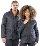 210T polyester with AC coating. 2x2 diamond quilted. Polyester padding and lining. Showerproof and windproof. Corduroy inner collar. Full length zip with studded storm flap. Two patch pockets with stud closure. Inner pocket. Jetted side vents. Bound open cuffs. Open hem. Cut out label. Access for decoration.