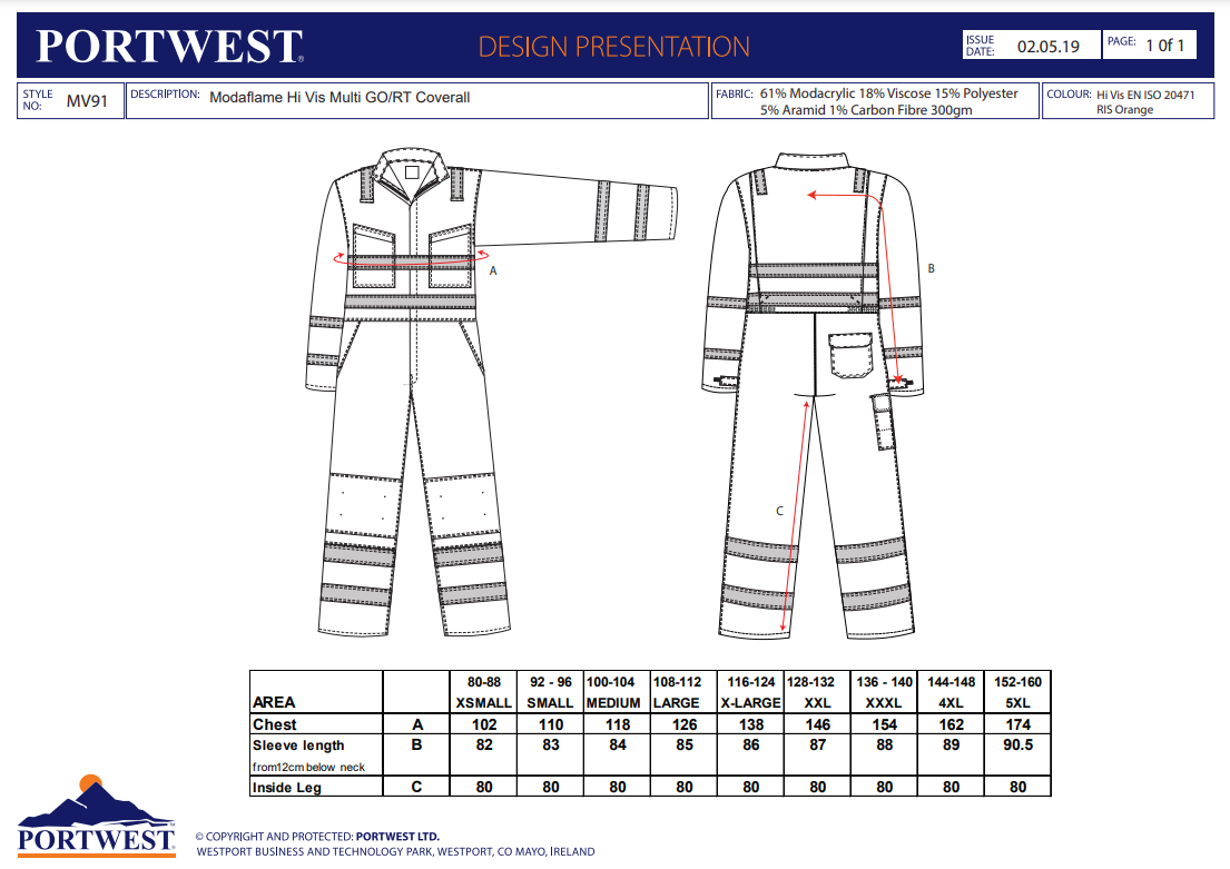 Datasheet - https://documents.portwest.com/datasheet.php?style=MV91&lang=GB&itemcol=MV91ORR&facility=902